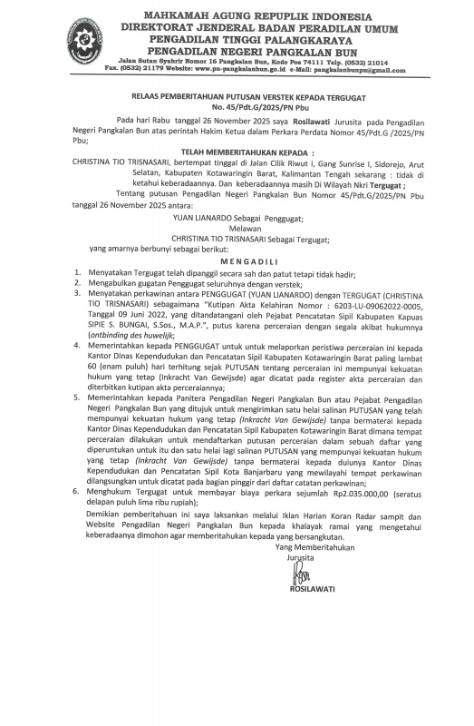 Berdasarkan Relaas Panggilan Nomor 45/Pdt.G/2025/PN Pbu telah memberitahukan kepada: