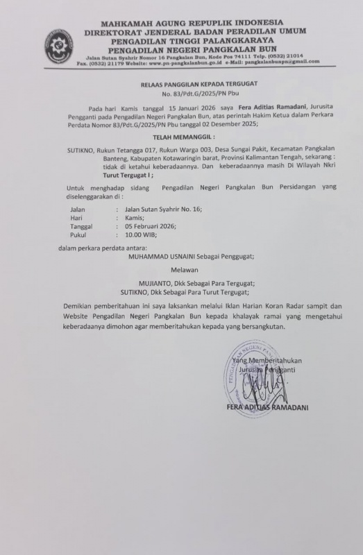 Relaas panggilan ini disampaikan melalui pengumuman di Harian Radar Sampit dan Website Pengadilan Negeri Pangkalan Bun sebagai bentuk pemanggilan resmi sesuai ketentuan hukum acara yang berlaku.