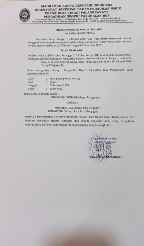 Pemanggilan ini bertujuan untuk menghadiri persidangan di Pengadilan Negeri Pangkalan Bun yang akan dilaksanakan pada hari Kamis, tanggal 05 Februari 2026, pukul 10.00 WIB, bertempat di Jalan Sutan Syahrir Nomor 16, Pangkalan Bun, dalam perkara perdata antara Muhammad Usnaini sebagai Penggugat melawan Mujianto, dkk sebagai Para Tergugat, serta Sutikno, dkk sebagai Para Turut Tergugat.