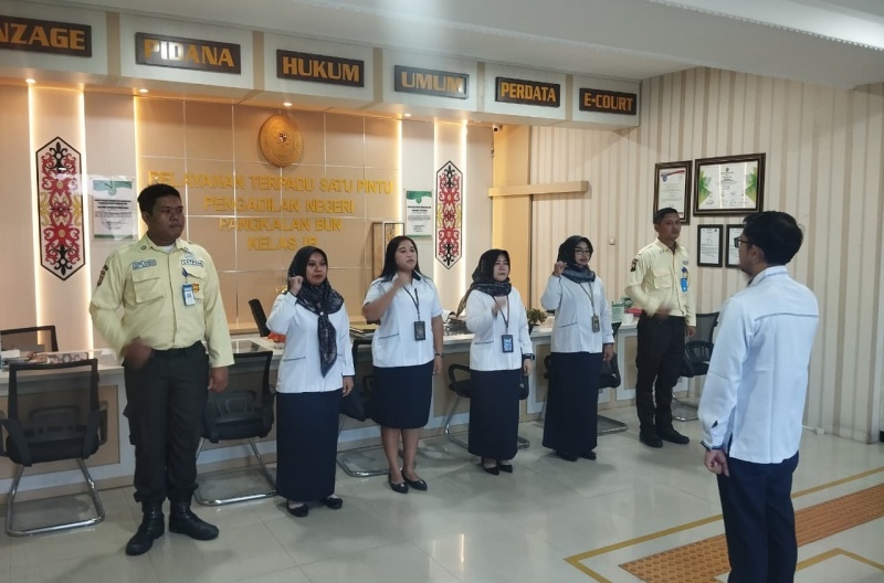 Pengadilan Negeri Pangkalan Bun melaksanakan kegiatan Briefing Pelayanan Terpadu Satu Pintu (PTSP) sebagai bentuk evaluasi dan penguatan kualitas pelayanan kepada masyarakat. Kegiatan briefing ini dipimpin oleh Hakim Pengadilan Negeri Pangkalan Bun, Bapak Pungky Wibowo, S.H., M.H.