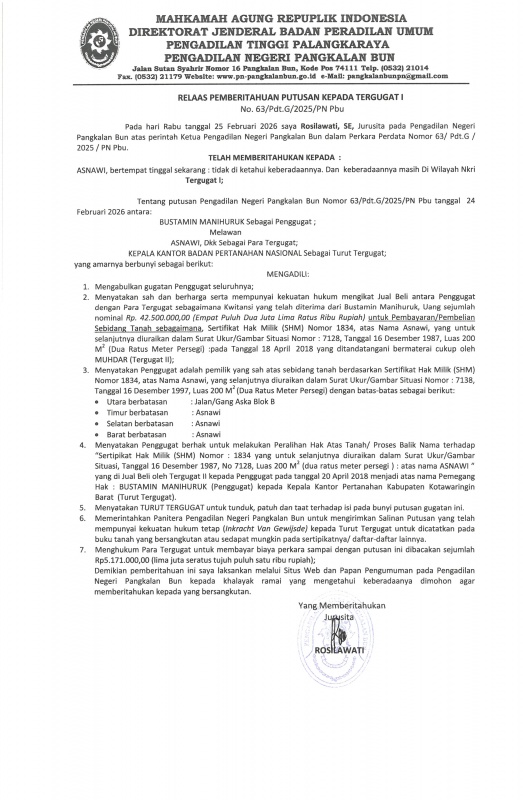 Pemberitahuan ini dilakukan pada Rabu, 25 Februari 2026, terkait Putusan Pengadilan Negeri Pangkalan Bun tanggal 24 Februari 2026 dalam perkara antara Bustamin Manihuruk sebagai Penggugat melawan Asnawi, dkk sebagai Para Tergugat serta Kepala Kantor Badan Pertanahan Nasional sebagai Turut Tergugat.