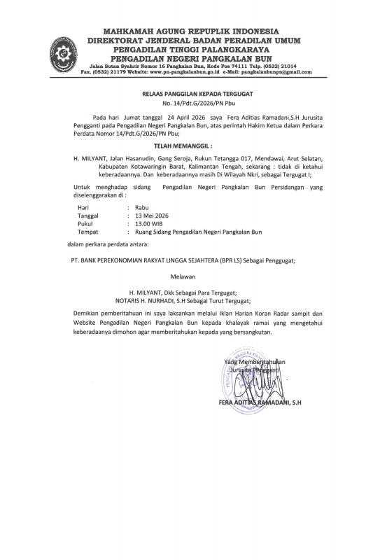 Pengadilan Negeri Pangkalan Bun melalui Jurusita Pengganti menyampaikan Relaas Panggilan kepada Tergugat I atas nama H. Milyant yang keberadaannya tidak diketahui, untuk menghadiri persidangan perkara perdata Nomor 14/Pdt.G/2026/PN Pbu.