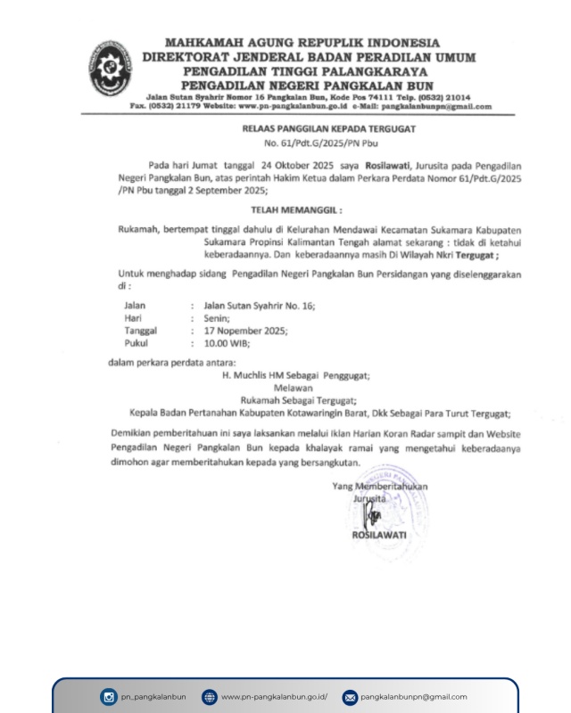 Pada hari Jumat tanggal 24 Oktober 2025 saya Rosilawati, Jurusita pada Pengadilan Negeri Pangkalan Bun, atas perintah Hakim Ketua dalam Perkara Perdata Nomor 61/Pdt.G/2025 /PN Pbu tanggal 2 September 2025;