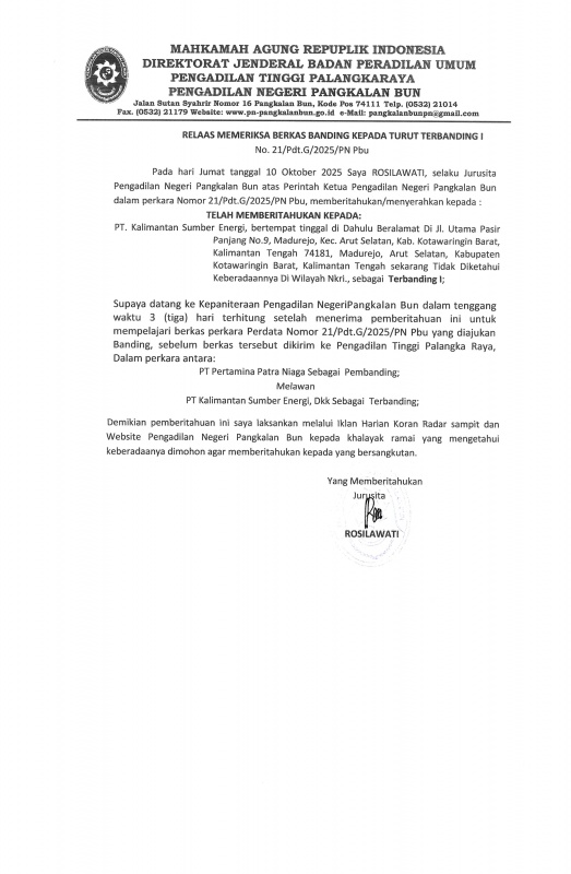 Pada hari Jumat tanggal 10 Oktober 2025 Saya ROSILAWATI, selaku Jurusita Pengadilan Negeri Pangkalan Bun atas Perintah Ketua Pengadilan Negeri Pangkalan Bun dalam perkara Nomor 21/Pdt.G/2025/PN Pbu, memberitahukan/menyerahkan kepada: