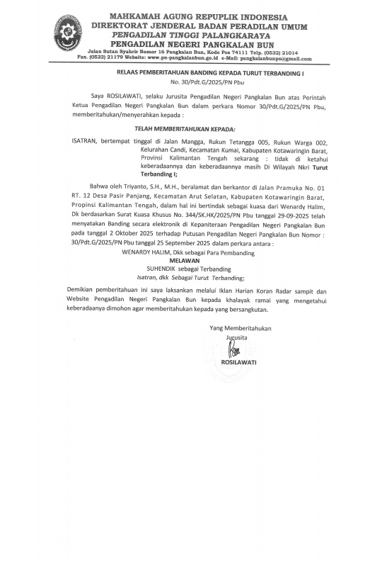 Demikian pemberitahuan ini saya laksankan melalui Iklan Harian Koran Radar sampit dan Website Pengadilan Negeri Pangkalan Bun kepada khalayak ramai yang mengetahui keberadaanya dimohon agar memberitahukan kepada yang bersangkutan.