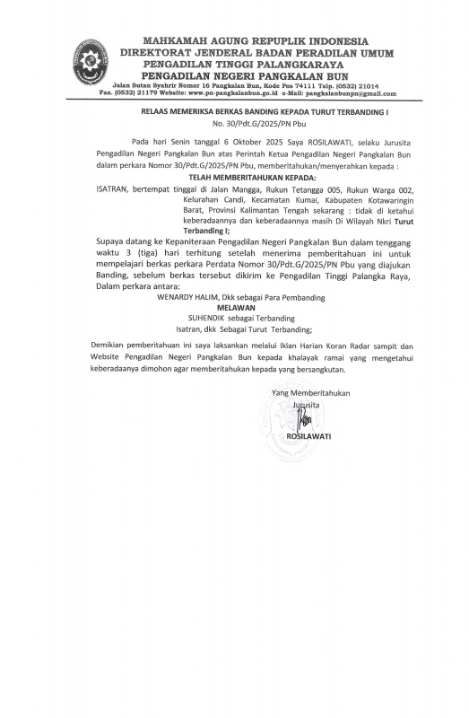 Demikian pemberitahuan ini saya laksankan melalui Iklan Harian Koran Radar sampit dan Website Pengadilan Negeri Pangkalan Bun kepada khalayak ramai yang mengetahui keberadaanya dimohon agar memberitahukan kepada yang bersangkutan.