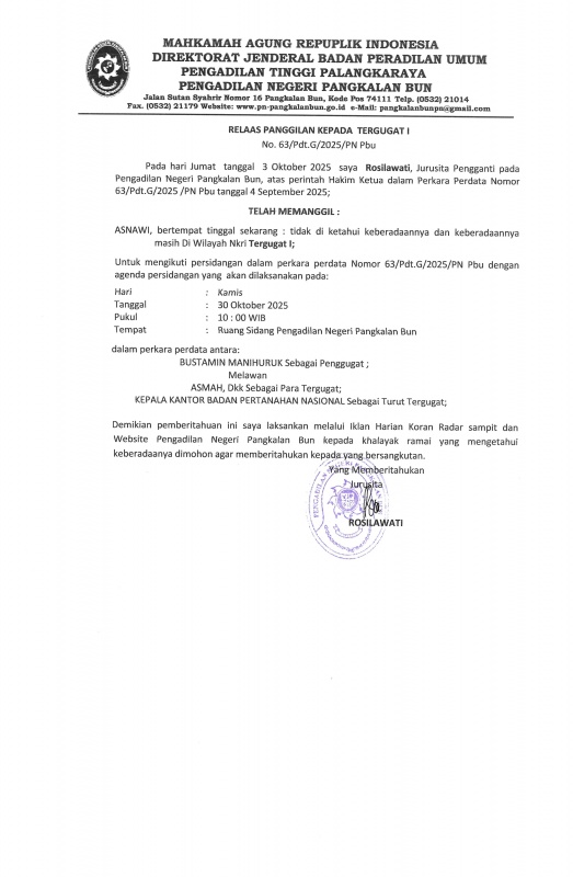 Pada hari Senin tanggal 06 Oktober 2025, Saya Rosilawati Jurusita pada Pengadilan Negeri Pangkalan Bun atas perintah Ketua Pengadilan Negeri Pangkalan Bun dalam Perkara Perdata Nomor 30/ Pdt.G /2025/PN Pbu.: