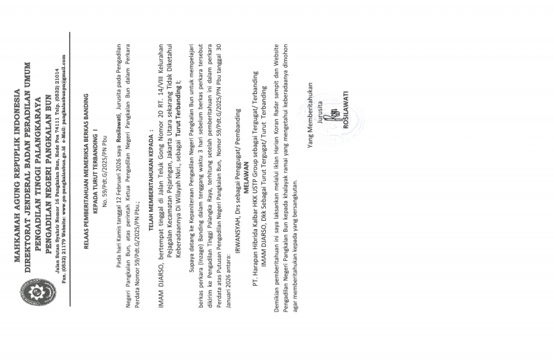 Pengadilan Negeri Pangkalan Bun melalui Jurusita Rosilawati telah melaksanakan Relaas Pemberitahuan Memeriksa Berkas (Inzage) Banding kepada Turut Terbanding I dalam Perkara Perdata Nomor 59/Pdt.G/2025/PN Pbu.