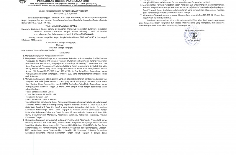 Relaas Pemberitahuan Putusan kepada Tergugat berdasarkan Putusan Pengadilan Negeri Pangkalan Bun Nomor 61/Pdt.G/2025/PN Pbu tanggal 3 Februari 2026. Pada hari Selasa, 3 Februari 2026, Jurusita Pengadilan Negeri Pangkalan Bun atas perintah Ketua Pengadilan Negeri Pangkalan Bun telah memberitahukan isi putusan perkara perdata antara H. Muchlis HM sebagai Penggugat melawan Rukamah sebagai Tergugat, yang terakhir diketahui bertempat tinggal di Kelurahan Mendawai, Kecamatan Sukamara, Kabupaten Sukamara, Provinsi Kalimantan Tengah, namun saat ini tidak diketahui keberadaannya dan dinyatakan masih berada di wilayah Negara Kesatuan Republik Indonesia.
