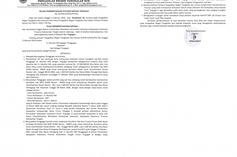 Pengadilan Negeri Pangkalan Bun telah menerbitkan Relaas Pemberitahuan Putusan kepada Tergugat berdasarkan Putusan Nomor 62/Pdt.G/2025/PN Pbu tanggal 3 Februari 2026 dalam perkara perdata antara H. Muchlis HM sebagai Penggugat melawan Awi sebagai Tergugat. Pemberitahuan dilakukan oleh Jurusita Pengadilan Negeri Pangkalan Bun karena Tergugat tidak diketahui keberadaannya dan dinyatakan masih berada di wilayah Negara Kesatuan Republik Indonesia.