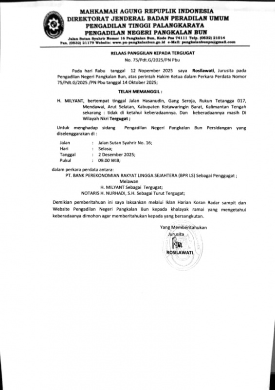 Pada hari Rabu tanggal 12 November 2025 saya Rosilawati, Jurusita pada Pengadilan Negeri Pangkalan Bun, atas perintah Hakim Ketua dalam Perkara Perdata Nomor 75/Pdt.G/2025 /PN Pbu tanggal 14 September 2025;