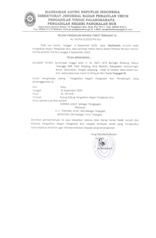 Pada hari Kamis tanggal 6 Nopember 2025 saya Rosilawati, Jurusita pada Pengadilan Negeri Pangkalan Bun, atas perintah Hakim Ketua dalam Perkara Perdata Nomor 64/Pdt.G/2025 /PN Pbu tanggal 4 September 2025;