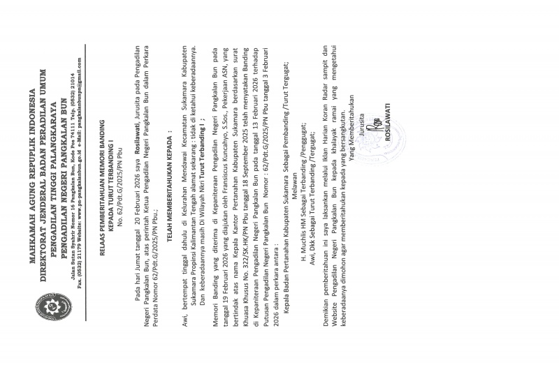 Pengadilan Negeri Pangkalan Bun melalui Jurusita Rosilawati telah melaksanakan Relaas Pemberitahuan Memori Banding kepada Turut Terbanding I dalam Perkara Perdata Nomor 62/Pdt.G/2025/PN Pbu.