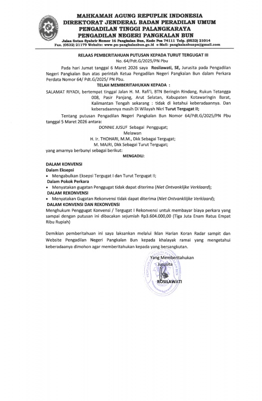 Pengadilan Negeri Pangkalan Bun melalui Jurusita Rosilawati, S.E., telah melaksanakan Relaas Pemberitahuan Putusan kepada Turut Tergugat III dalam Perkara Perdata Nomor 64/Pdt.G/2025/PN Pbu.