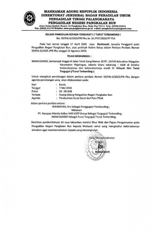 Pengadilan Negeri Pangkalan Bun menyampaikan relaas panggilan kepada Tergugat I/Turut Terbanding I dalam perkara perdata Nomor 59/Pdt.G/2025/PN Pbu jo. 16/PDT/2026/PT PLK. Panggilan ini ditujukan kepada saudara Imam Djarso yang saat ini tidak diketahui keberadaannya.