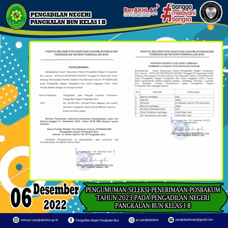 Pengadilan Negeri Pangkalan Bun membuka Seleksi Penerimaan Pos Bantuan Hukum (POSBAKUM) untuk tahun anggaran 2023. Untuk info lebih lengkap dapat langsung datang ke Kantor Pengadilan Negeri Pangkalan Bun.