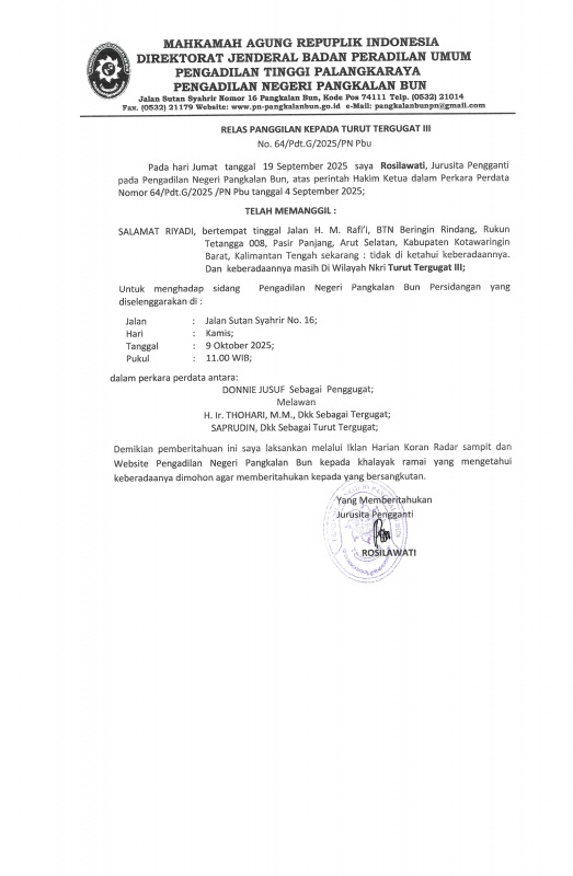 PANGGILAN AANMANING PERKARA PERDATA NOMOR 64/Pdt.G/2025/PN Pbu Kepada SALAMAT RIYADI