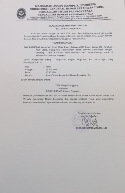 Pengadilan Negeri Pangkalan Bun menyampaikan Relaas Panggilan kepada Tergugat Nomor 12/Pdt.G/2026/PN Pbu kepada Roki Purnomo, yang beralamat terakhir di Jalan Patih Gajah Mata, RT 002/RW 002, Panahan, Arut Utara, Kabupaten Kotawaringin Barat, Provinsi Kalimantan Tengah, yang saat ini tidak diketahui keberadaannya.